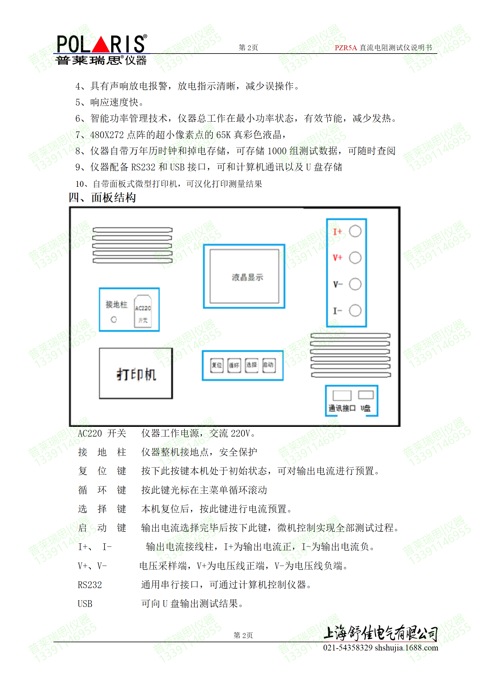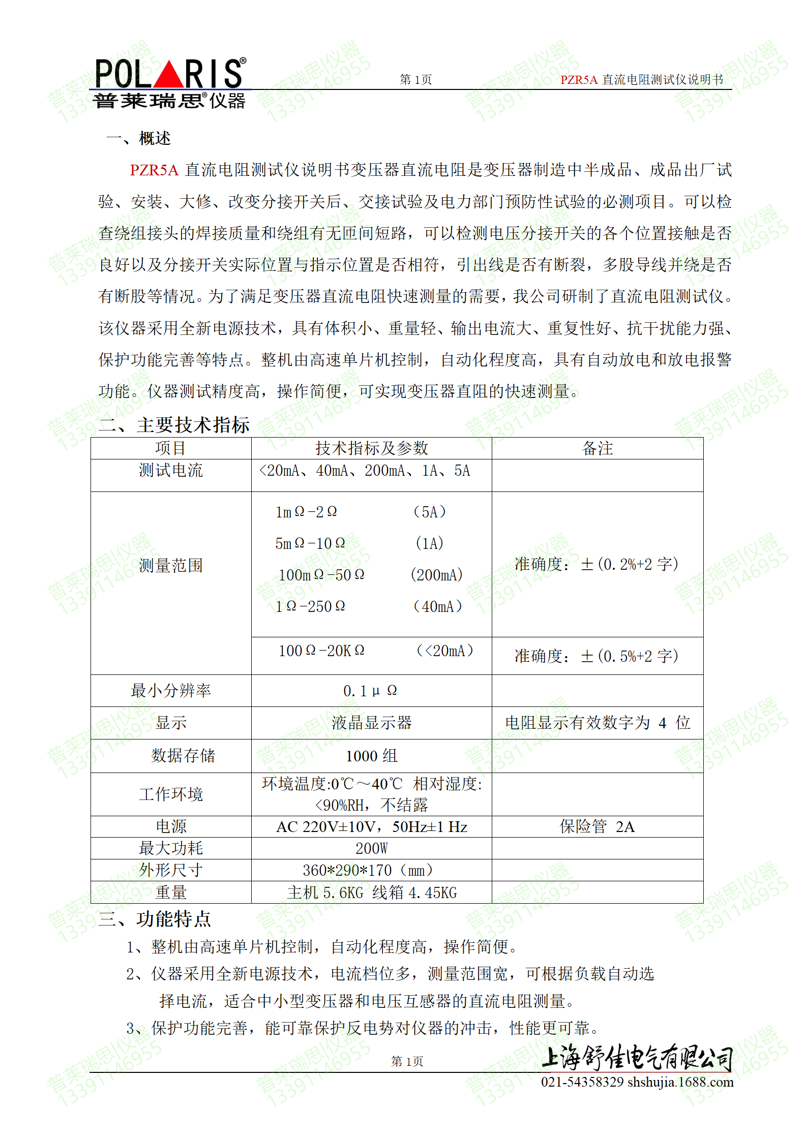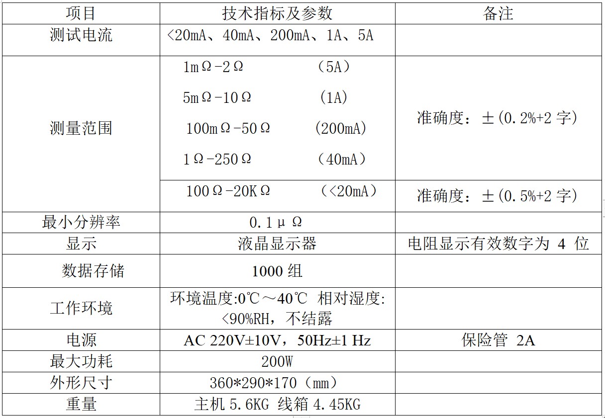 PZR5A直流电阻测试仪说明书变压器直流电阻是变压器制造中半成品、成品出厂试验、安装、大修、改变分接开关后、交接试验及电力部门预防性试验的必测项目。可以检查绕组接头的焊接质量和绕组有无匝间短路,可以检测电压分接开关的各个位置接触是否良好以及分接开关实际位置与指示位置是否相符,引出线是否有断裂,多股导线并绕是否有断股等情况。为了满足变压器直流电阻快速测量的需要,我公司研制了直流电阻测试仪。该仪器采用全新电源技术,具有体积小、重量轻、输出电流大、重复性好、抗干扰能力强、保护功能完善等特点。整机由高速单片机控制,自动化程度高,具有自动放电和放电报警功能。仪器测试精度高,操作简便,可实现变压器直阻的快速测量。