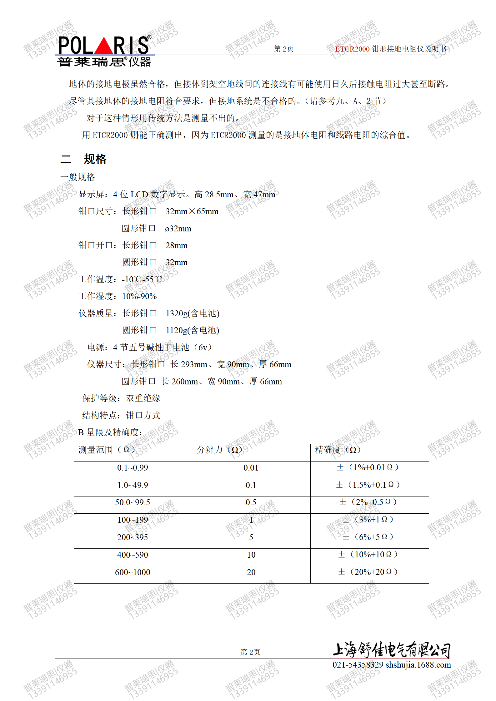 ETCR2000钳形接地电阻仪用于电力、电信、气象以及其它设备的接地电阻测量。电阻仪有长钳口及圆钳口之分,长钳口特别适用于扁钢接地线的场合。传统的接地电阻测量方法是采用电压—