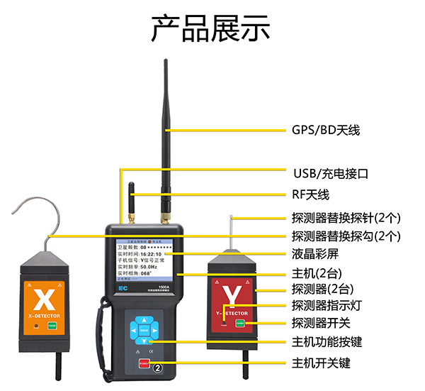 EC1500A远程高压核相仪是同时具备超远距离核相和普通近距离核相功能,具有卫星精准授时功能,实现远距离核相、近距离普通、地下室核相、矿井下核相,授时精度小于20nS,可以同时接收六种卫星授时系统的GNSS信号,并且实现联合授时,确保核相精准。普通核相距离200米(在空旷场所),卫星核相距离5000米。本核相仪既可以高压线路,还可以在高压开关柜(中置柜、环网柜等)进行核相,突破传统核相器电压等级限制问题,可以在极低电压线路中核相,完全实现从10V~500kV电压自动核相,操作简易,省时快捷。同时还具有测试相位、频率、相序、变压器组别判断等功能,以及验电及电压等级显示功能。当线路电压超过110kV,必须使用非接触核相,核相时将探测器的金属探钩逐渐靠近导线,当感应到电场信号即可完成核相,无需直接接触高压导线,安全快速。用于环网柜核相时,探测器必须使用探针及环网柜测试线。