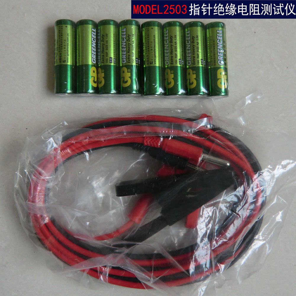 附件 :铝合金(5000V/10000V)或工程塑料(5000V以下)包装箱,(8节1.5V五号碱性电池,测试导线,产品说明合格证)各一份,测试线2根,高压线棒(连在表上)1付;