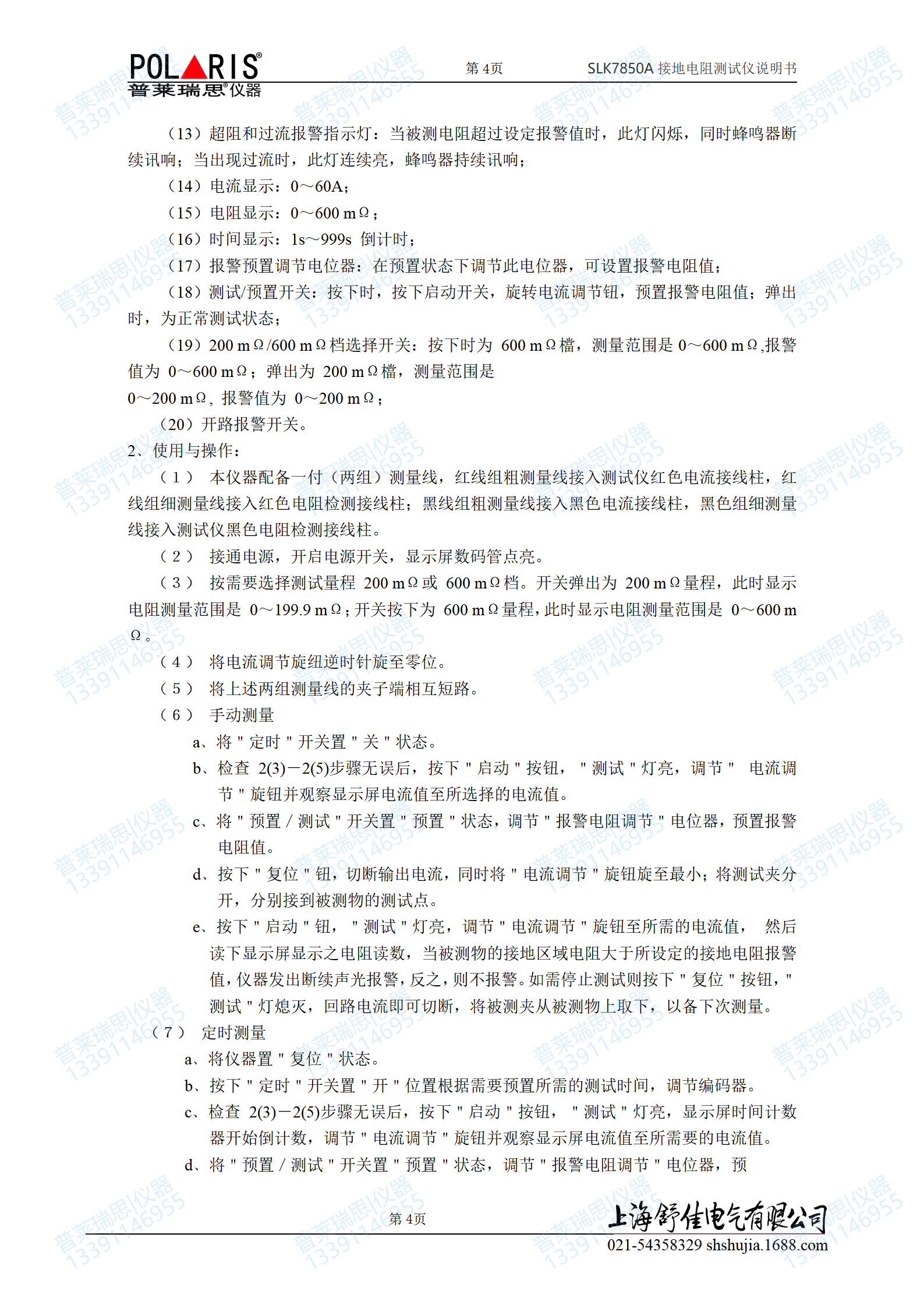 6﹑报警电阻值: 0 ~ 200mΩ (AC 60A) 连续可调 精度:±5%